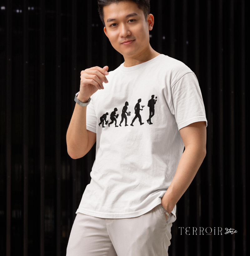 Esta camiseta apresenta uma estampa criativa que mostra a evolução do homem culminando em um brinde com uma taça de vinho. Ideal para os amantes de vinho que apreciam humor e um design inteligente, esta peça é perfeita para expressar sua paixão pela bebida de uma forma divertida e elegante. Perfeita para ocasiões sociais ou momentos descontraídos, mostrando que o vinho é parte essencial da evolução humana.