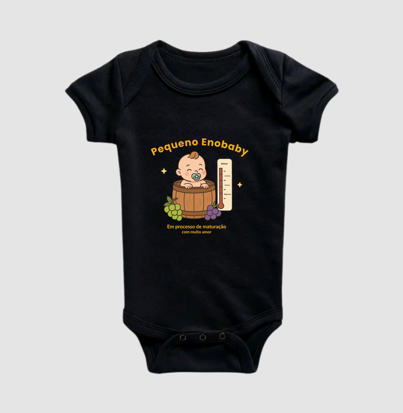 O body "Pequeno Enobaby" é perfeito para os pais apaixonados por vinhos e cheios de amor! Com uma estampa encantadora, traz um bebê dentro de um barril com o divertido termômetro de amor, carinho, soneca e bagunça, mostrando que o seu pequeno está “em processo de maturação com muito amor”. Feito para unir fofura e estilo, esse body é ideal para momentos descontraídos e fotos que aquecem o coração! Um presente único para os pequenos que já nasceram rodeados de amor e bom gosto.