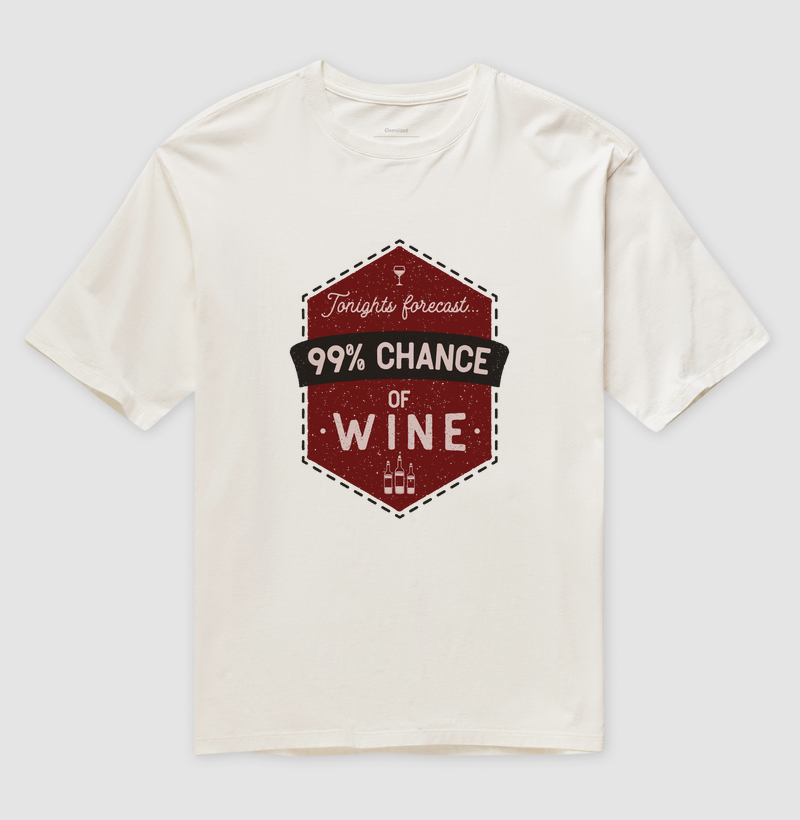 Esta camiseta apresenta uma estampa divertida e convidativa, perfeita para os amantes de vinho. O design é composto por um distintivo estilizado em vermelho vinho, com a frase humorística "Tonight's forecast... 99% chance of wine". Ideal para encontros com amigos ou qualquer ocasião casual onde o vinho seja a estrela, esta camiseta permite que você expresse seu amor pela bebida de uma forma alegre e descontraída. Perfeita para adicionar um toque de humor ao seu guarda-roupa, esta estampa é uma excelente escolha para quem aprecia a cultura do vinho com um sorriso.
