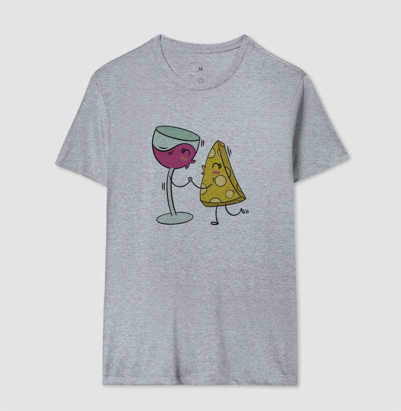 A estampa "Par Perfeito: Vinho e Queijo" traz um toque divertido e fofo para os amantes dessa icônica combinação gastronômica. Com personagens animados de uma taça de vinho e um pedaço de queijo dançando alegremente, esta camiseta celebra o prazer de harmonizar essas delícias. Perfeita para quem adora momentos descontraídos entre amigos, degustações ou apenas relaxar com essa dupla irresistível. Vista essa peça e mostre sua paixão por um dos maiores pares da culinária!