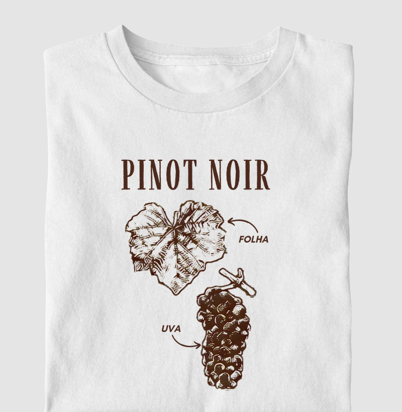 **Nome da Estampa:** Pinot Noir Essência **Descrição:** Delicada e elegante, a uva Pinot Noir é conhecida como a rainha das uvas tintas. Originária da Borgonha, na França, é valorizada por seus vinhos de cor leve, aromas de frutas vermelhas, como cereja e framboesa, e notas sutis de especiarias. Esta estampa celebra a complexidade e o charme da Pinot Noir, destacando a singularidade de sua folha e cachos. Uma escolha perfeita para quem aprecia vinhos leves, refinados e com personalidade marcante.