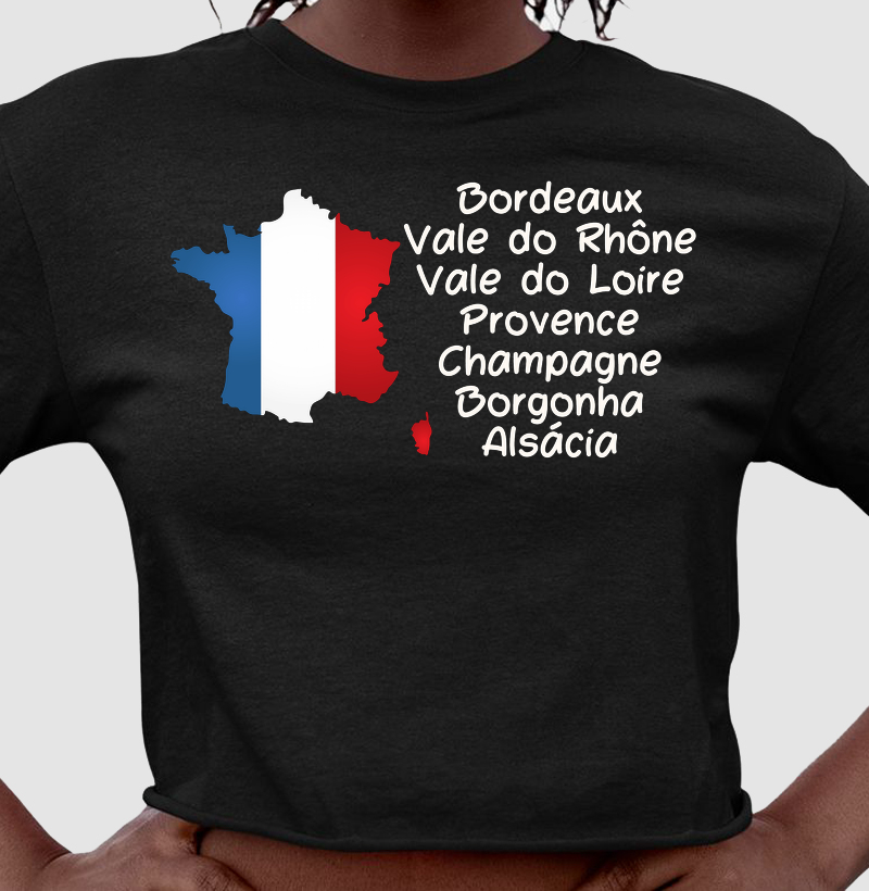 Esta camiseta apresenta uma estampa que celebra as principais regiões viníferas da França, com um design estilizado da bandeira francesa ao fundo. As palavras "Vale do Rhône", "Vale do Loire", "Provence", "Champagne" e "Borgonha" estão destacadas, representando algumas das mais renomadas áreas produtoras de vinho do país. Ideal para os amantes de vinho que desejam expressar sua paixão pela vinicultura francesa com estilo e elegância.
